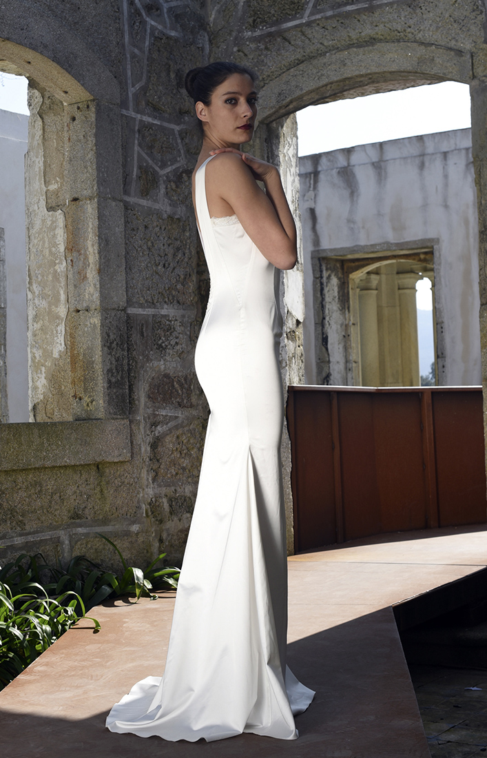 Descripción: Vestido de novia de corte sirena confeccionado en un lujoso y suave tejido. Con escote en V y tirantes triangulares. Motivos de mariposas en el escote y en la espalda, realizados a mano con encaje de Camariñas exclusivos de nuestra colección.