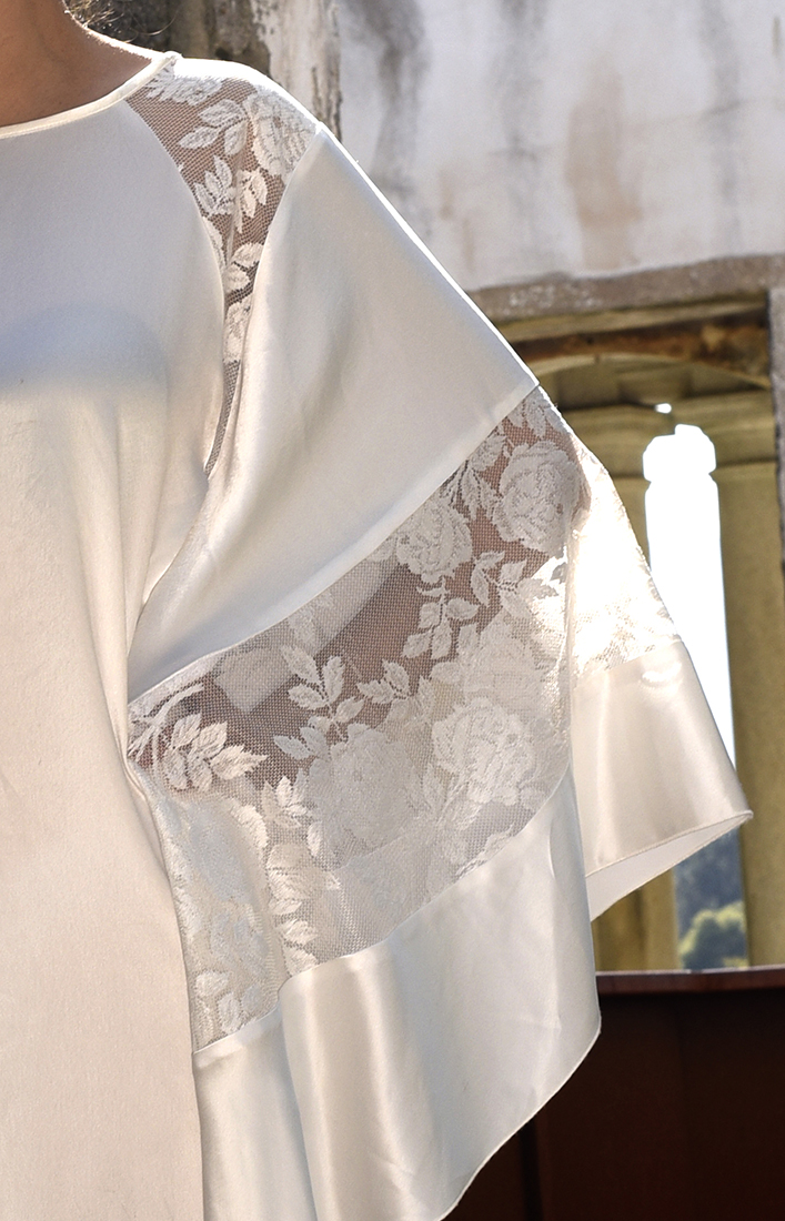 Descripción: Vestido blanco en raso y con mangas murciélago, escote alto y transparencias.