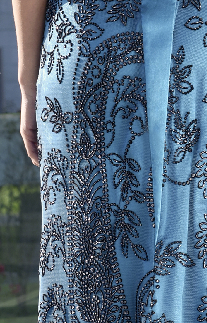 Cuenta con un precioso escote en pico y corte sirena. Su tejido de raso azul con tul de plumeti lo hacen una prenda única. Diseñada por nuestro atellier y realizado a mano para una mujer moderna y sofisticada.