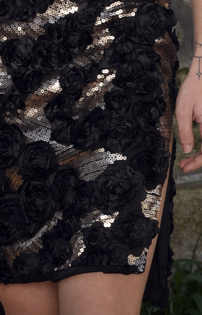 Short coctail dress with two fabrics with sequins and plain several parts in colour black and golden.