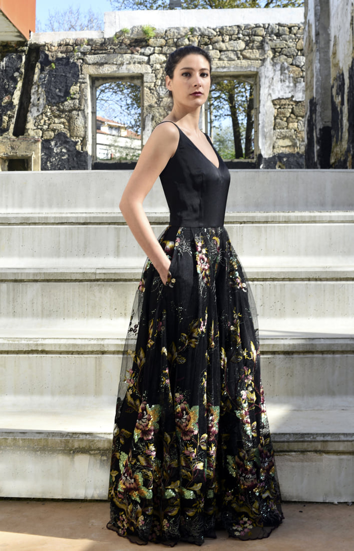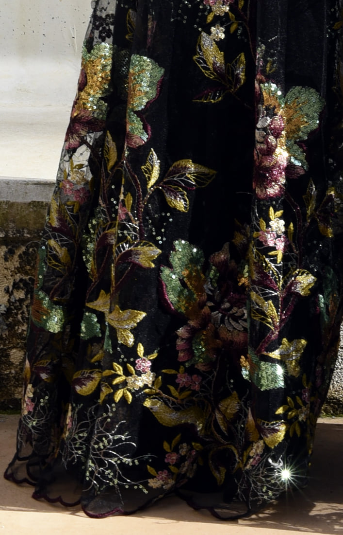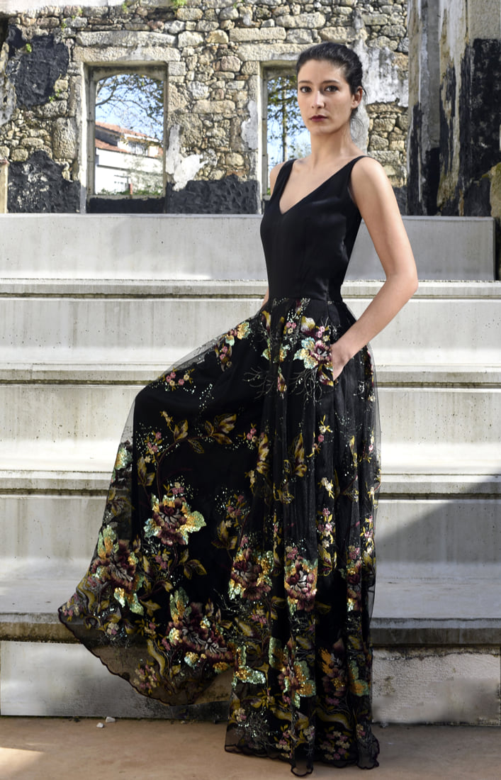 Dos tejidos han sido combinados a la perfección. Se ha escogido un color neutro, liso como el negro para dar elegancia y esbeltez a la zona superior y por otro, se ha escogido un estampado floral de varios colores, pero con fondo negro para crear una sinergia perfecta en el diseño.