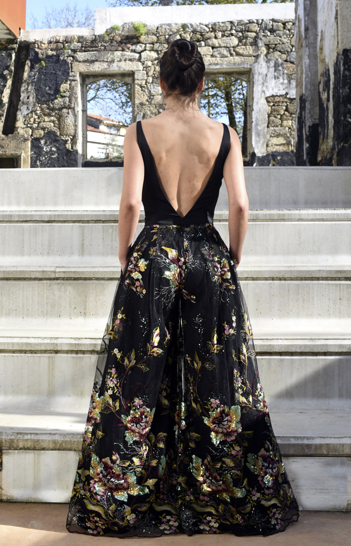Tejido: Mono negro con tejido bordado en las piernas, y tejido satén liso color negro, a juego de fondo y en parte superior.
