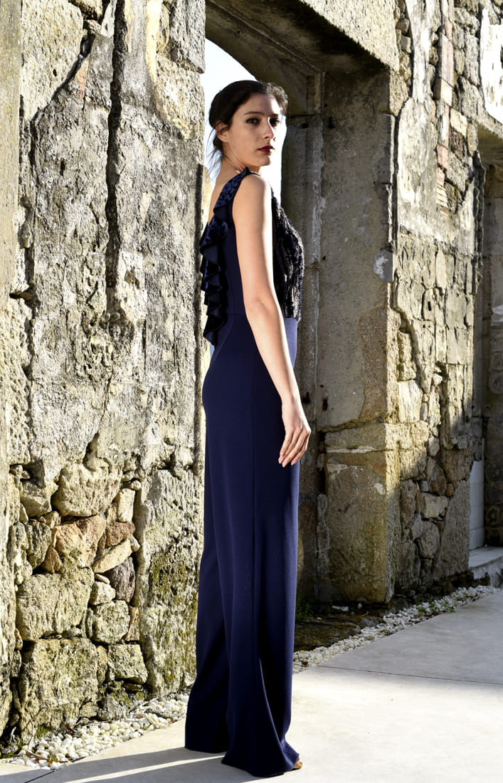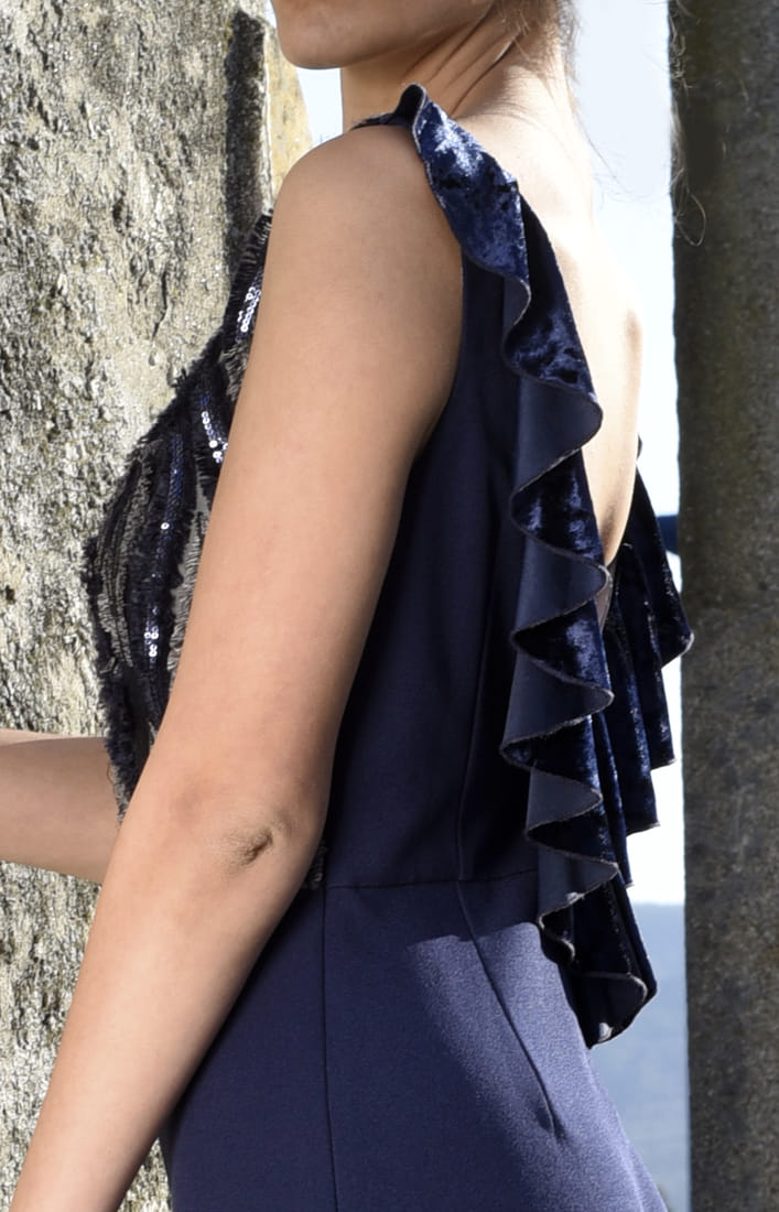 Por un lado, la parte de la cima y delantera están confeccionados con un bonito y exclusivo tejido realizado con lentejuelas y plumas en color azul marino grisáceo. La parte del pantalón está confeccionado y cortado de forma recta para resaltar y aumentar el largo de la pierna, está confeccionado con un crepe mate en el mismo color (azul marino) para rematar la zona de la espalda con un tejido en terciopelo del mismo color.