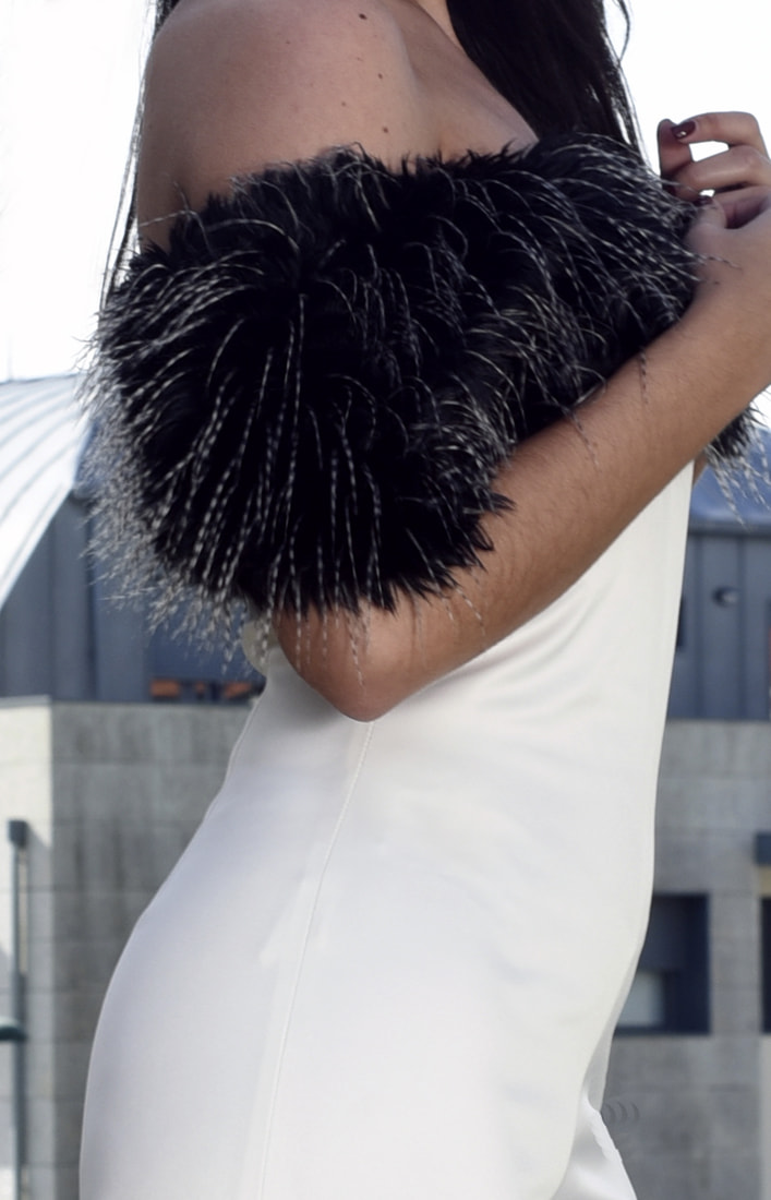 Cima y espalda: Espalda asimétrica con hombros al descubierto adornado con el cuello de pelo sintético en varios colores.