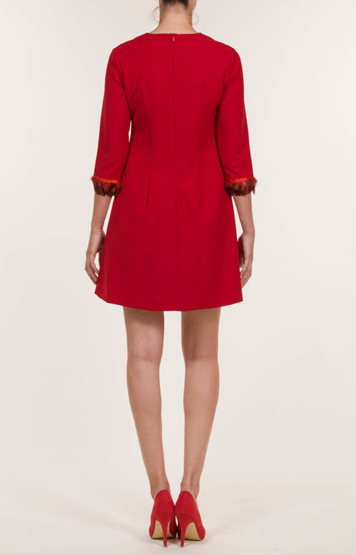 Descripción: Vestido corto de cocktail, con tejido crepe mate en color rojo, a juego con plumas en mangas.