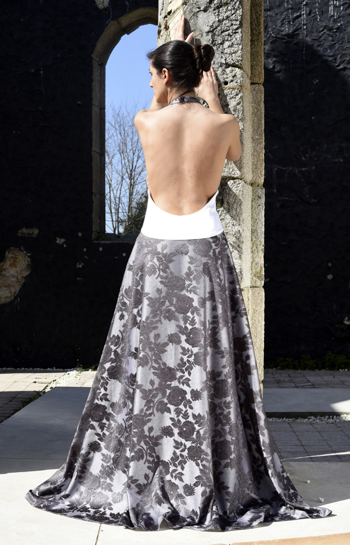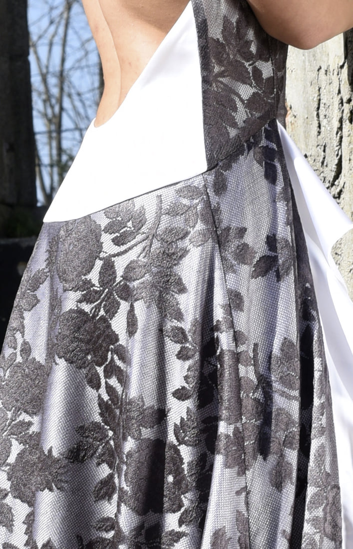 Vestido largo con apertura en ambas partes de las piernas, en tejido de encaje de flores, en color gris plomo, sobre tejido de satén liso en color blanco, y en volantes de la falda.