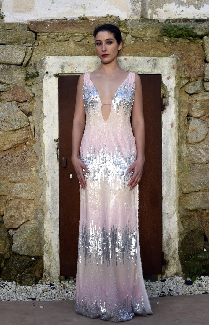 Vestido largo confeccionado en tejido de lentejuelas multicolor con base elástica para un ajuste cómodo y favorecedor. Escote en «V» profundo con adorno de pedrería discreta para mayor sujeción. Corte entallado sin mangas y caída recta hasta el suelo. Forro interior suave y cierre oculto en la parte trasera. Diseñado y elaborado artesanalmente en España por Javier Barrio.