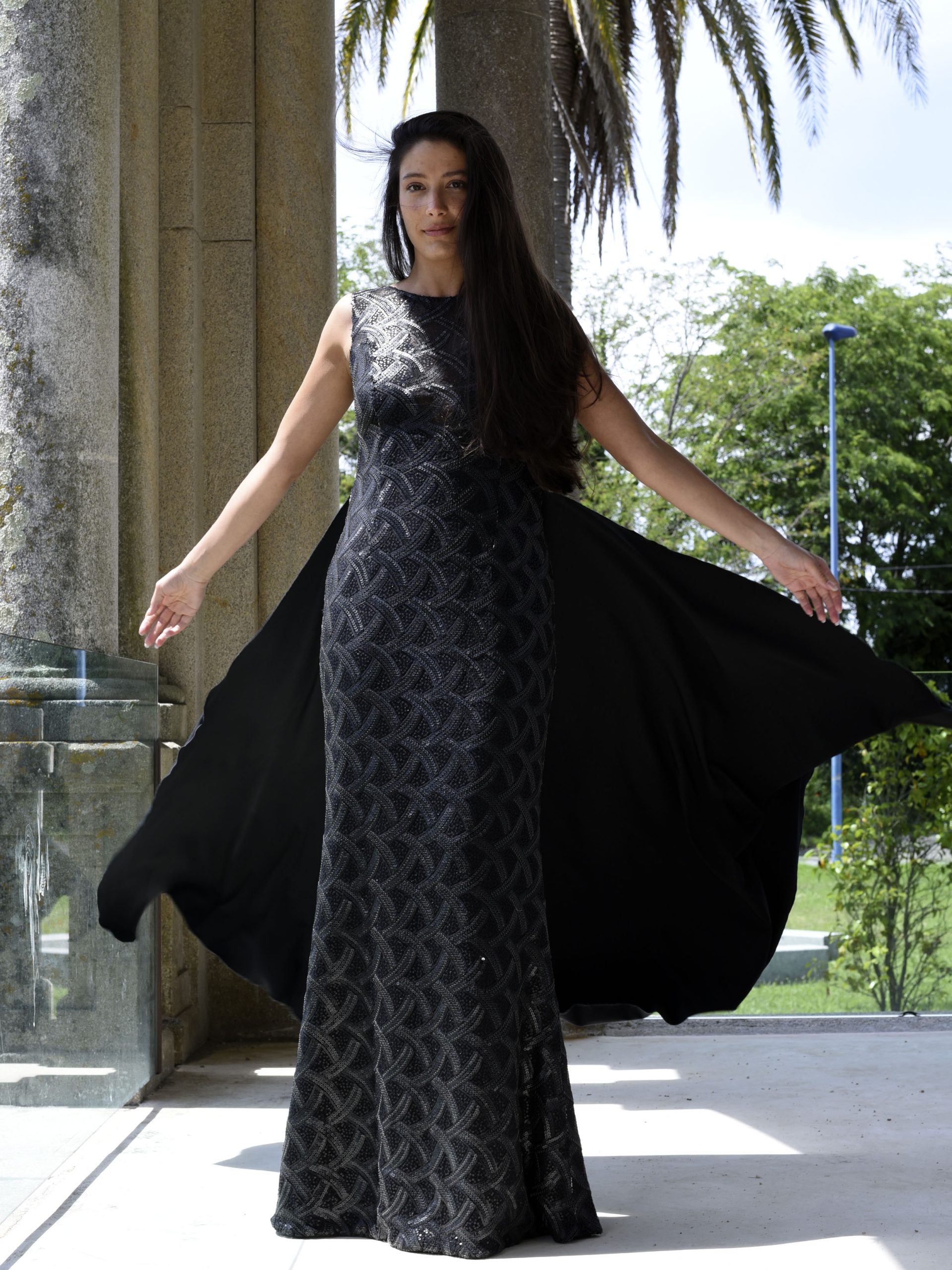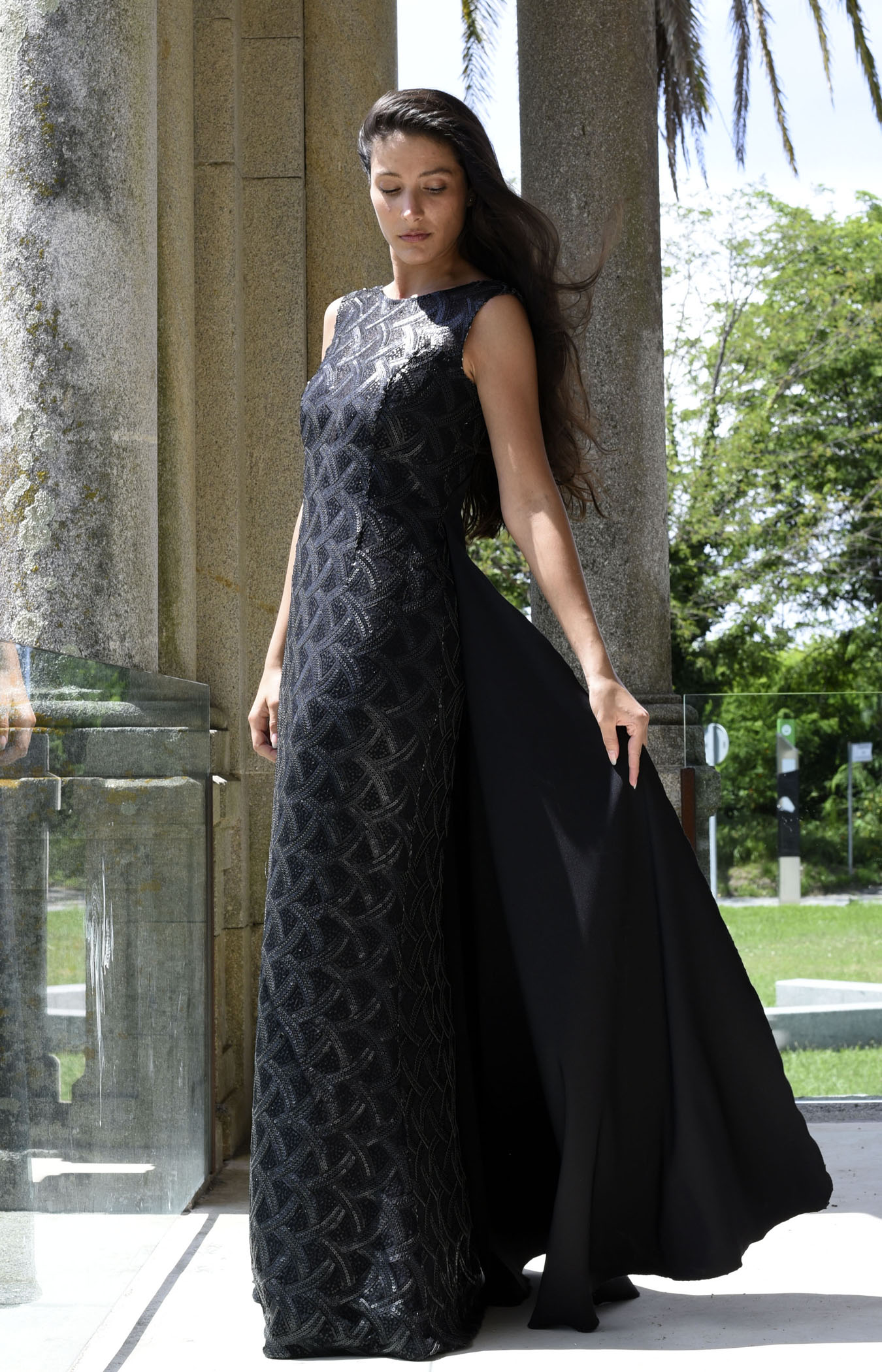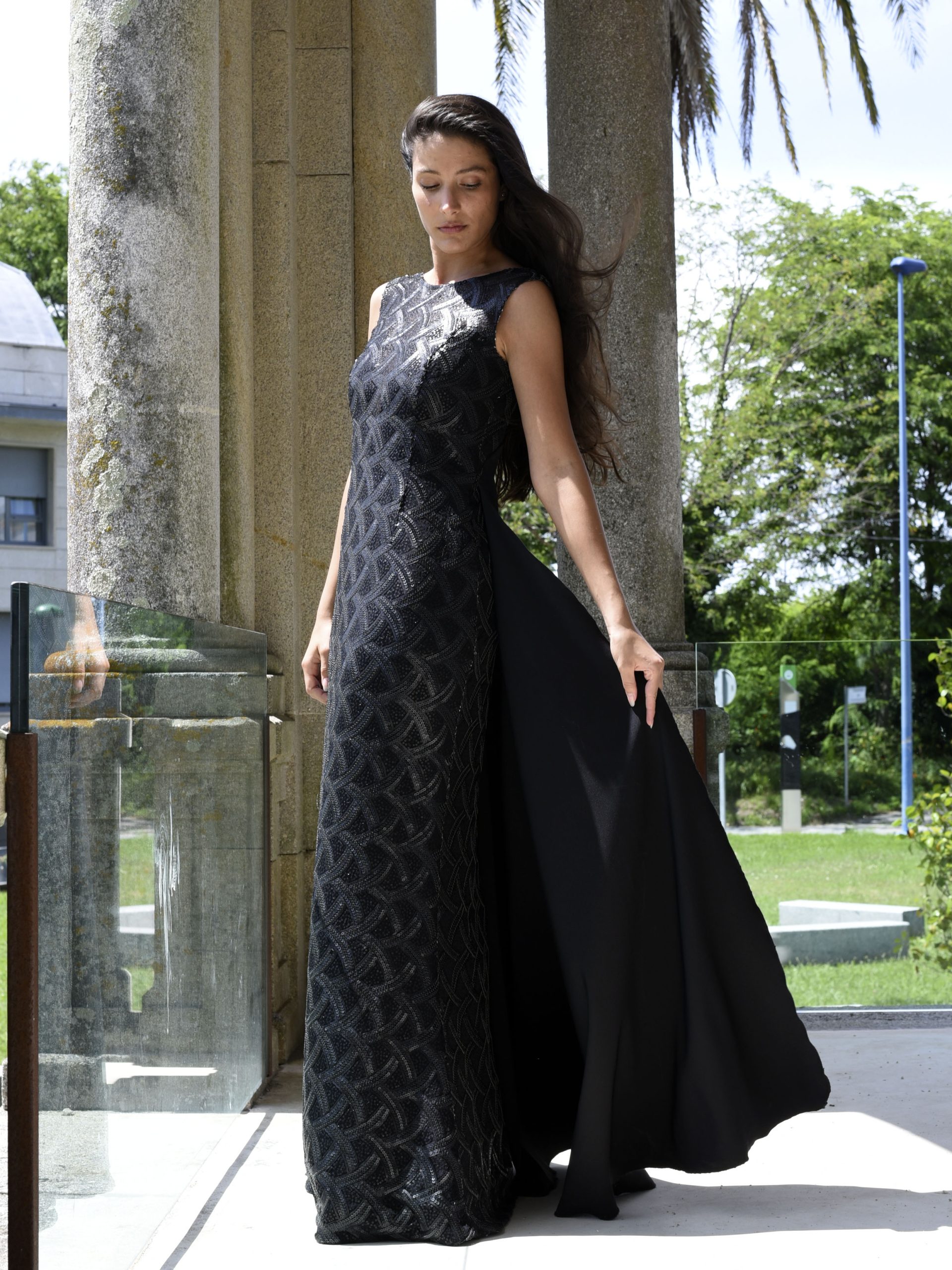 Vestido largo de alta costura en color negro, creación exclusiva del diseñador Javier Barrio. Esta pieza deslumbra por su elegancia sobria y poderosa. El cuerpo del vestido está completamente bordado a mano con un sofisticado diseño geométrico de lentejuelas negras, generando un juego de luz sutil y refinado. La sobrecola en gasa mate aporta majestuosidad y movimiento, envolviendo a quien lo viste con un aura de distinción.