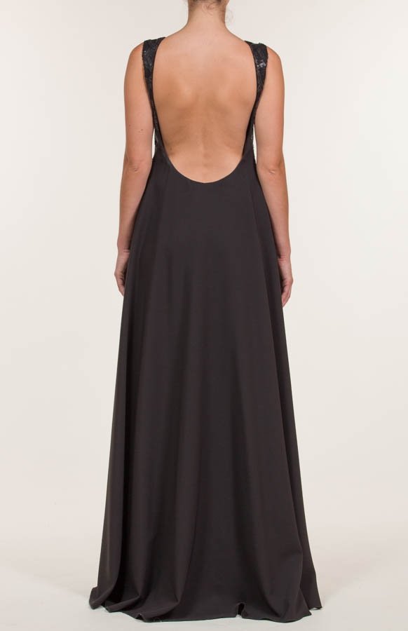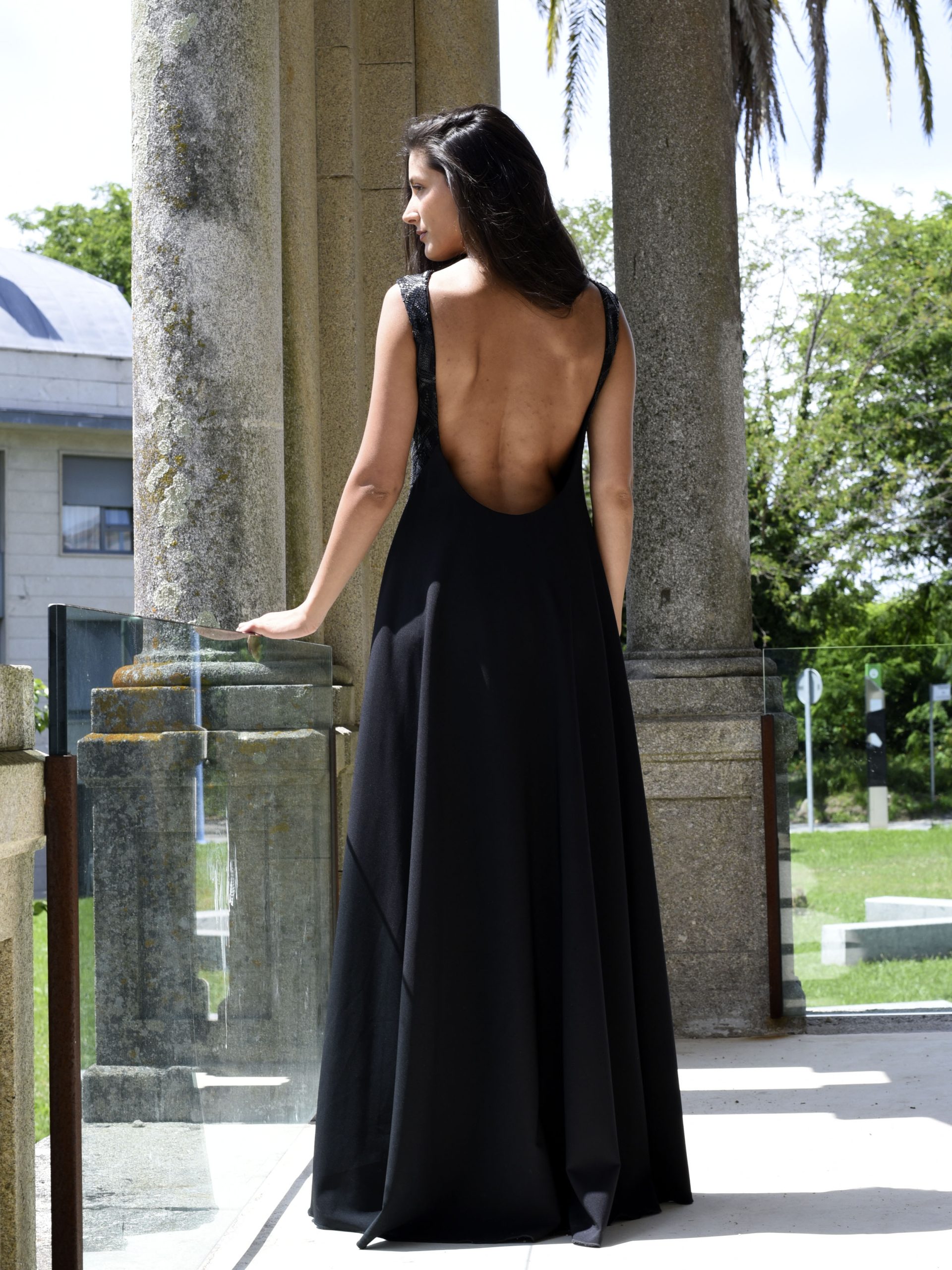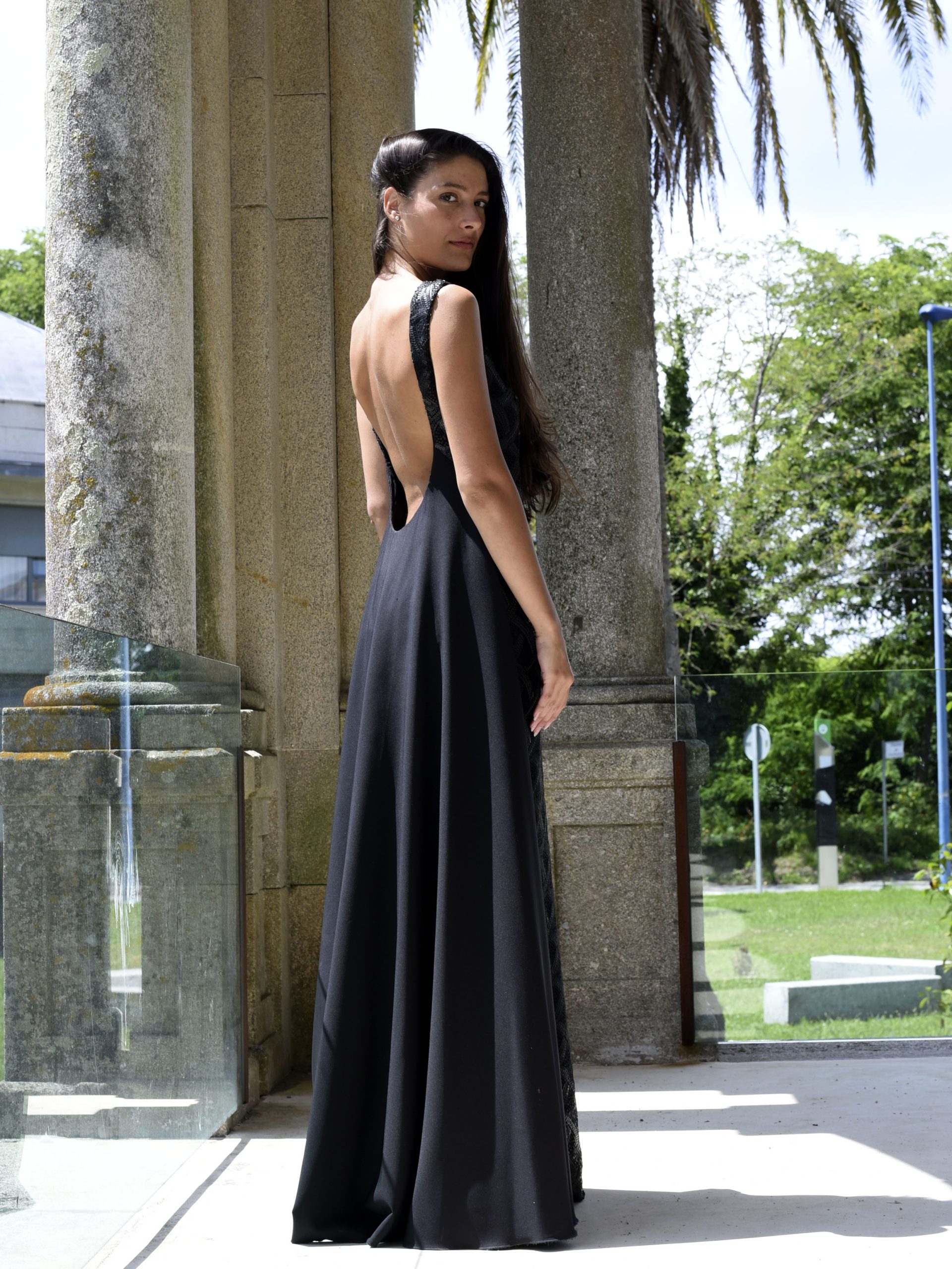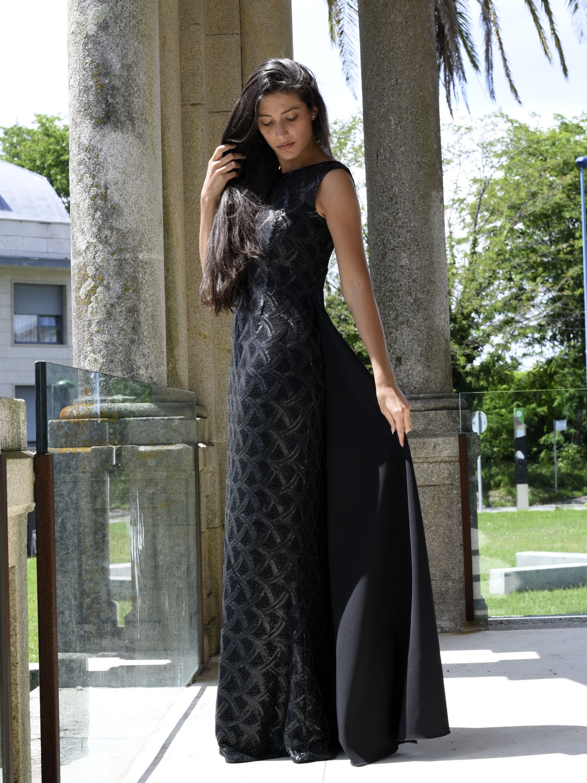 Vestido largo de alta costura en color negro, creación exclusiva del diseñador Javier Barrio. Esta pieza deslumbra por su elegancia sobria y poderosa. El cuerpo del vestido está completamente bordado a mano con un sofisticado diseño geométrico de lentejuelas negras, generando un juego de luz sutil y refinado. La sobrecola en gasa mate aporta majestuosidad y movimiento, envolviendo a quien lo viste con un aura de distinción.