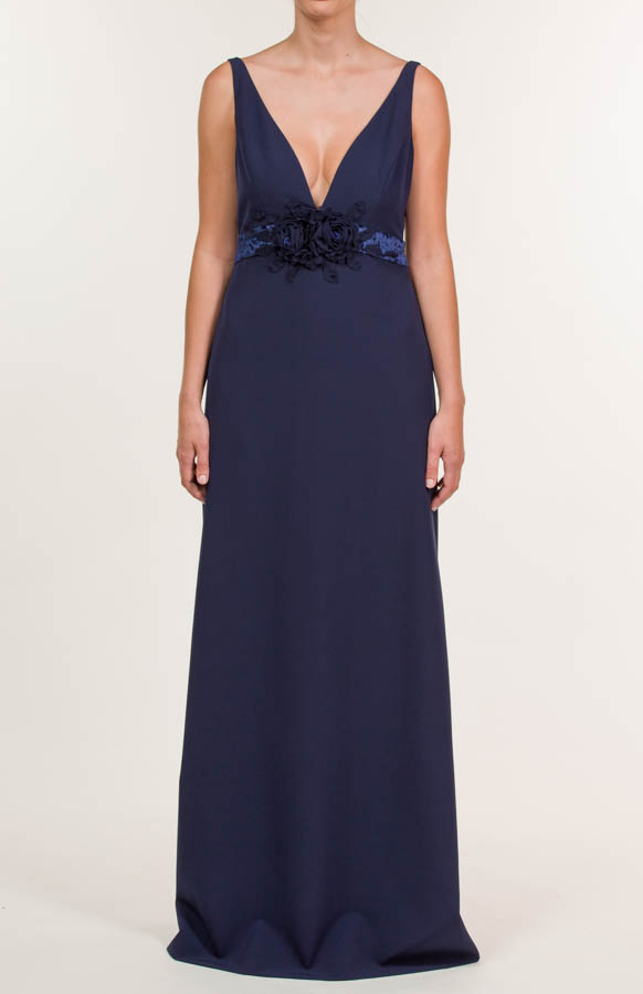Vestido largo en tejido de crepe mate en color azul marino, a juego con terciopelo en color azul marino en cintura, y aplique de flores bordadas, con pedrería en color azul marino en el centro de la cintura.