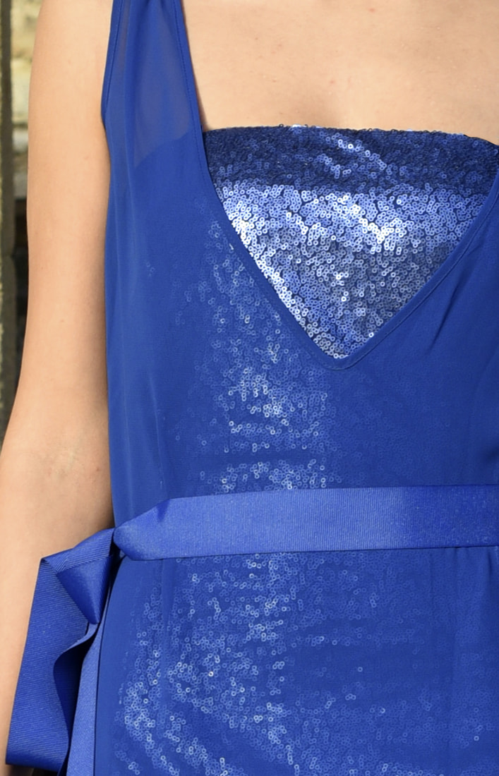 Vestido largo, en tejido de lentejuelas azul egipcio, con tejido en gasa de seda color azul egipcio, superpuesto encima del vestido y cinta en cadera en color azul egipcio.