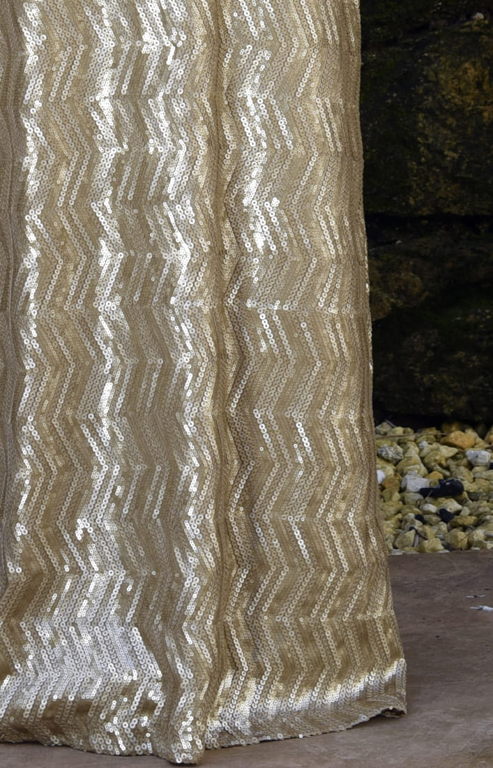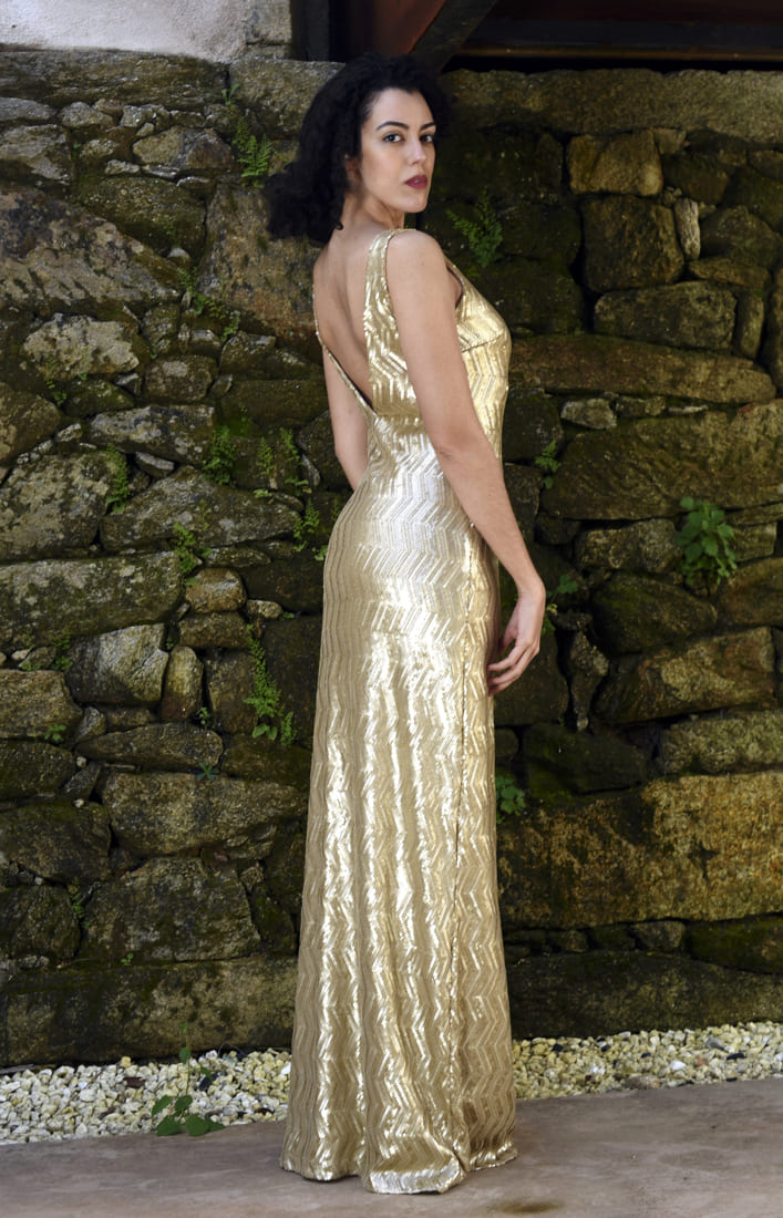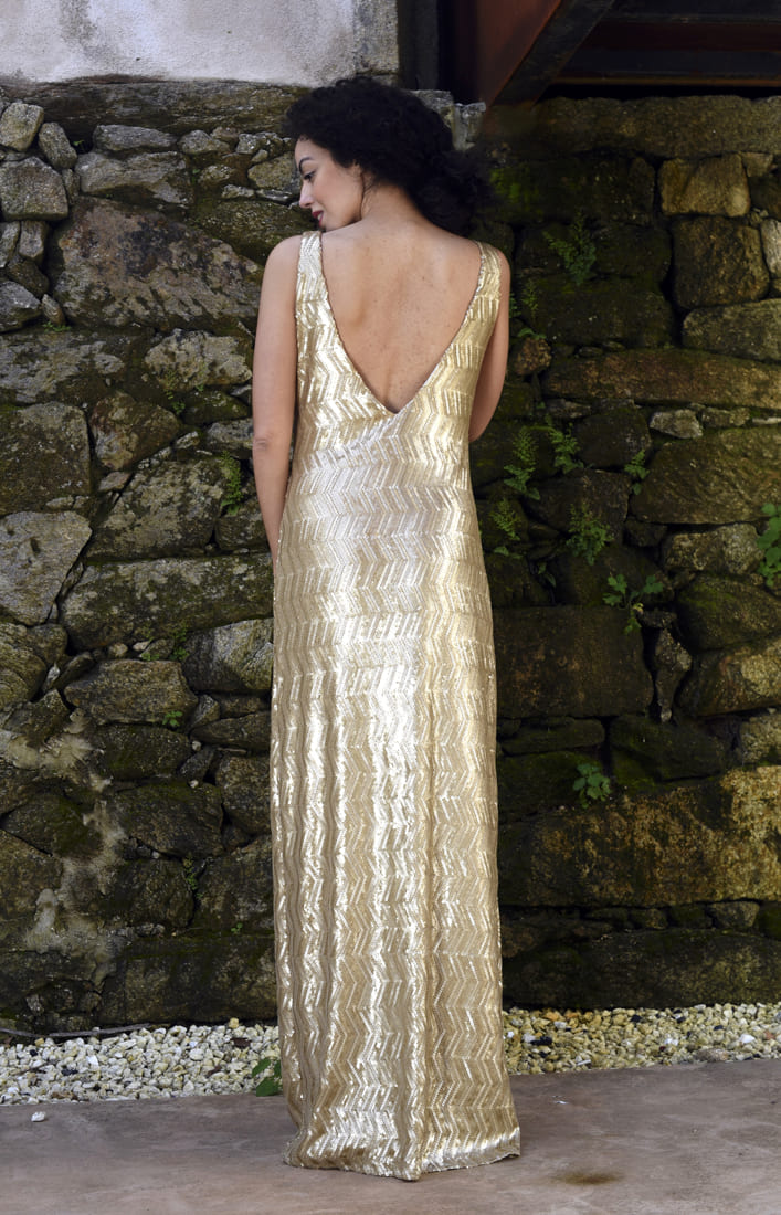 Vestido largo, con tejido en lentejuela color dorado semibrillo.