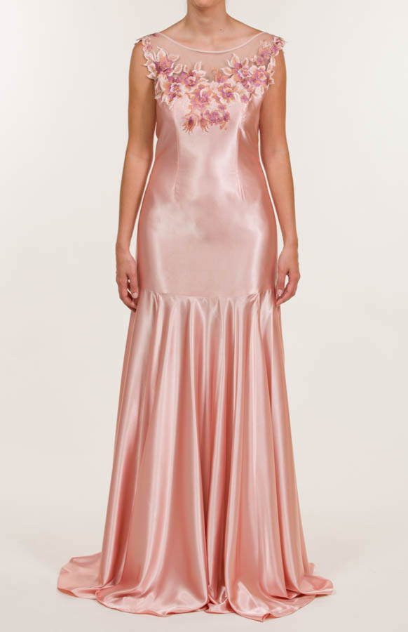 Vestido largo en tejido satén liso, color rosa zinwaldita, a juego con tejido bordado aplicado en escote y hombros, con tejido de tul blanco.