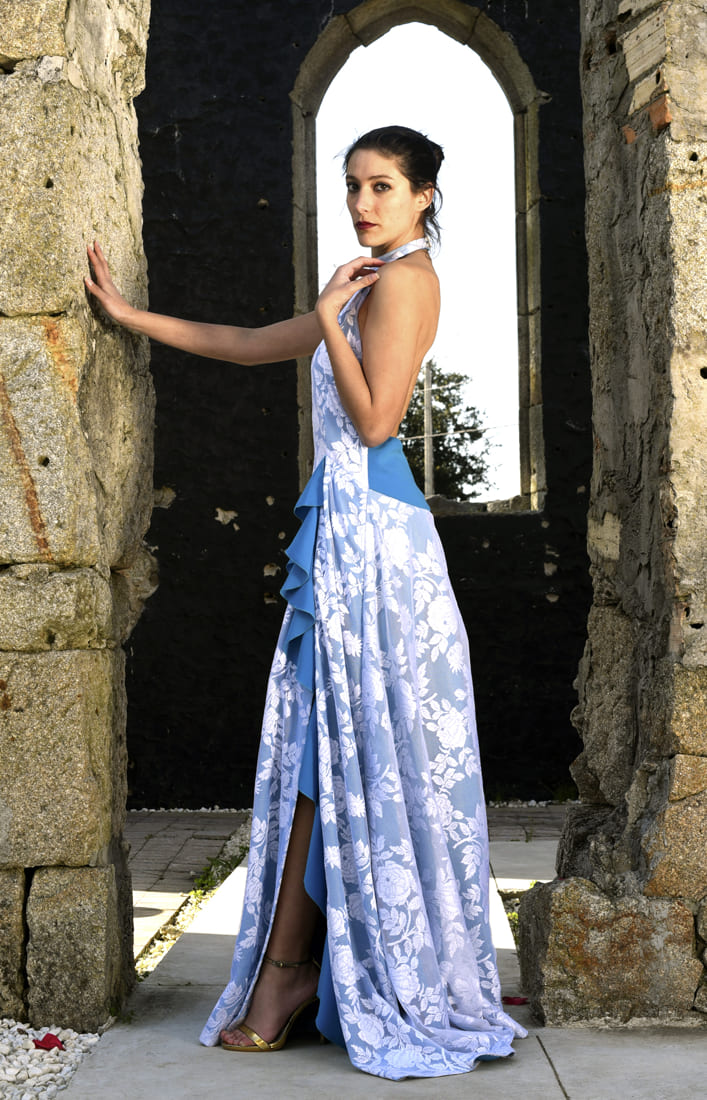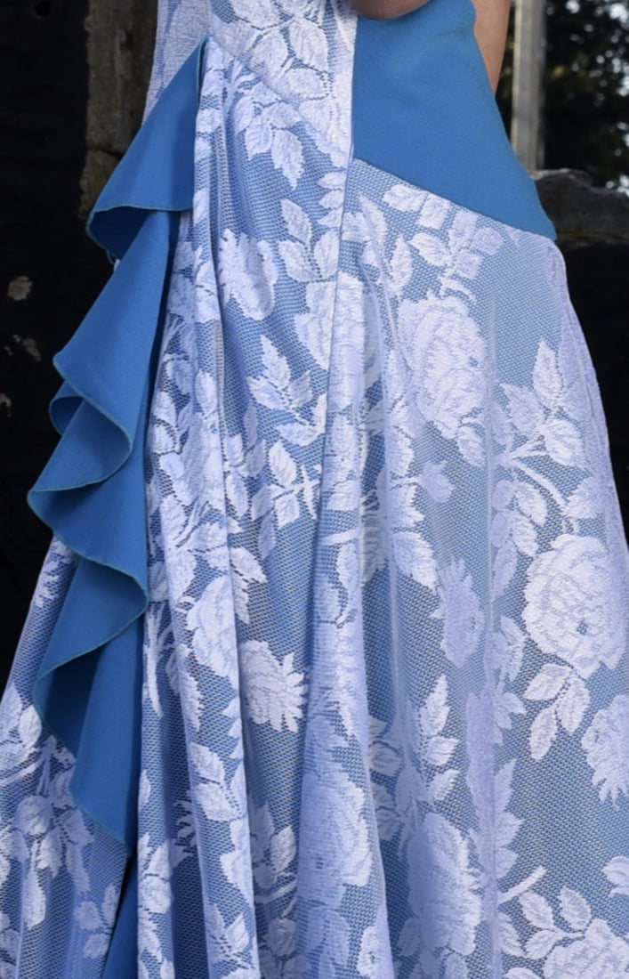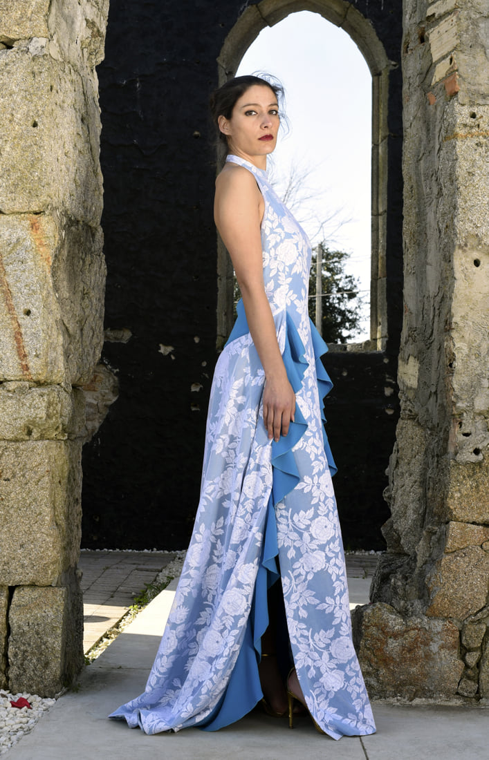 Vestido largo con apertura en ambas partes de las piernas, en tejido de encaje de flores, en color blanco, sobre tejido de crepe mate liso en color azul maya, y en volantes de la falda.