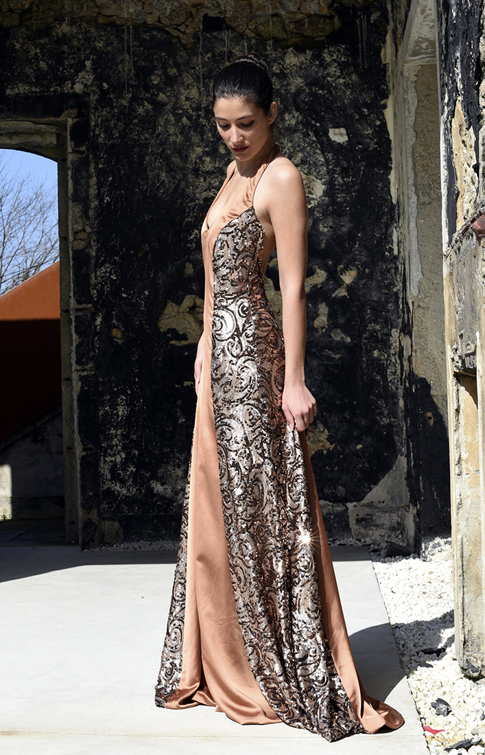 CARACTERÍSTICAS: Vestido largo de color terracota con corte sirena. Con combinación de satén liso en cuerpo y parte trasera de la falda y tejido con lentejuela en laterales y trasera. Lleva cuello halter con escote en forma de pico y espalda totalmente abierta hasta la base de la misma. Se cierra con una cremallera invisible de alta calidad del mismo tono que el vestido ubicada en un lateral.