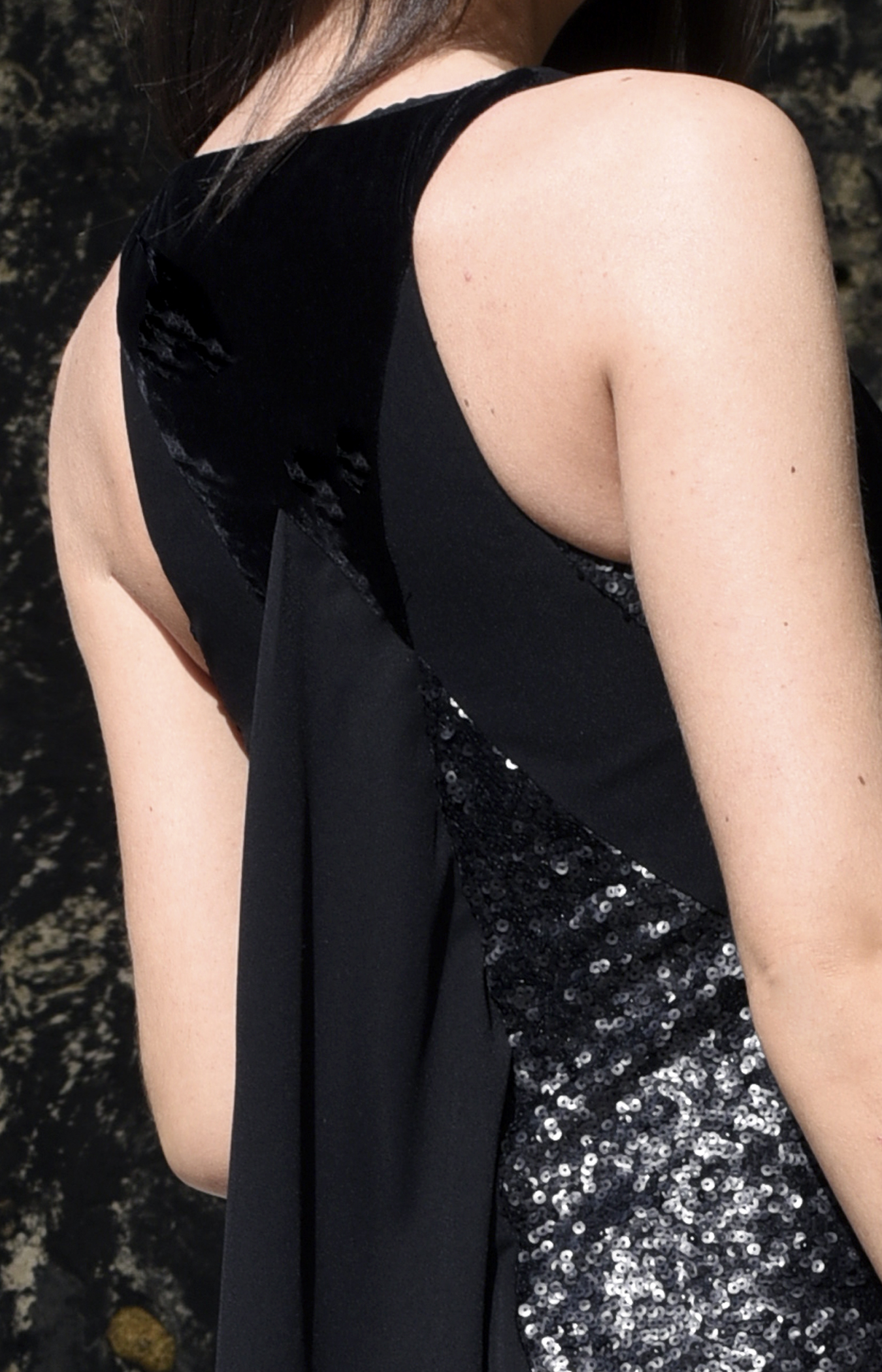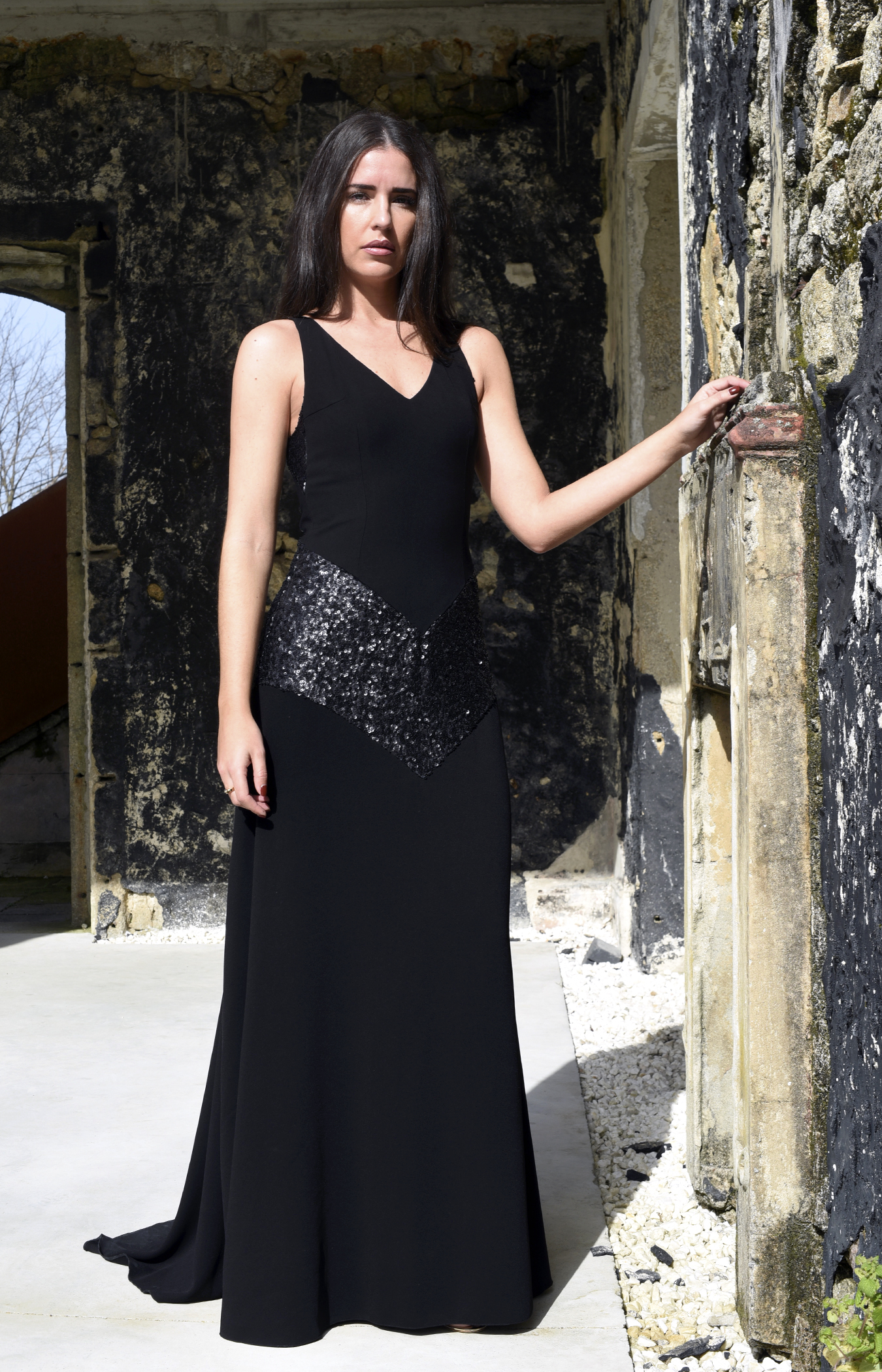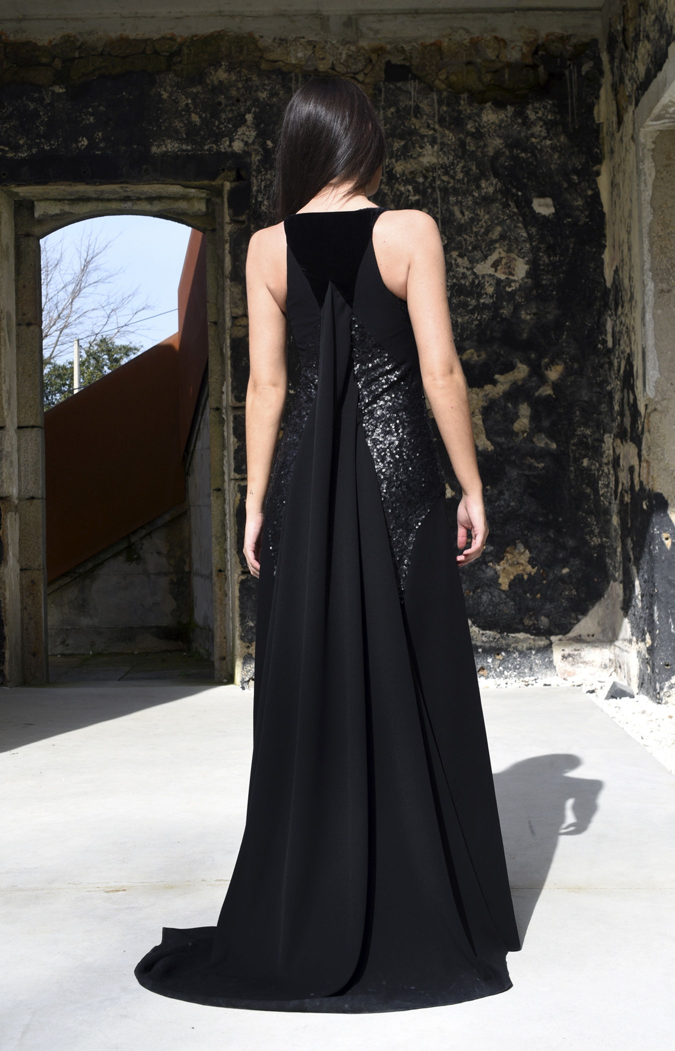 Esta creación está confeccionada en un crepé negro de alta calidad, que aporta peso y movimiento, acompañado por un panel central y costados en tejido de lentejuelas negras, cuidadosamente bordado para aportar contraste, textura y luz al conjunto. El brillo de las lentejuelas se integra con sutileza en la falda y la parte trasera, donde un elegante pliegue central añade volumen y movimiento. Como todas las piezas de Javier Barrio Couture, ha sido diseñada y confeccionada en España, con acabados impecables y atención a cada detalle.