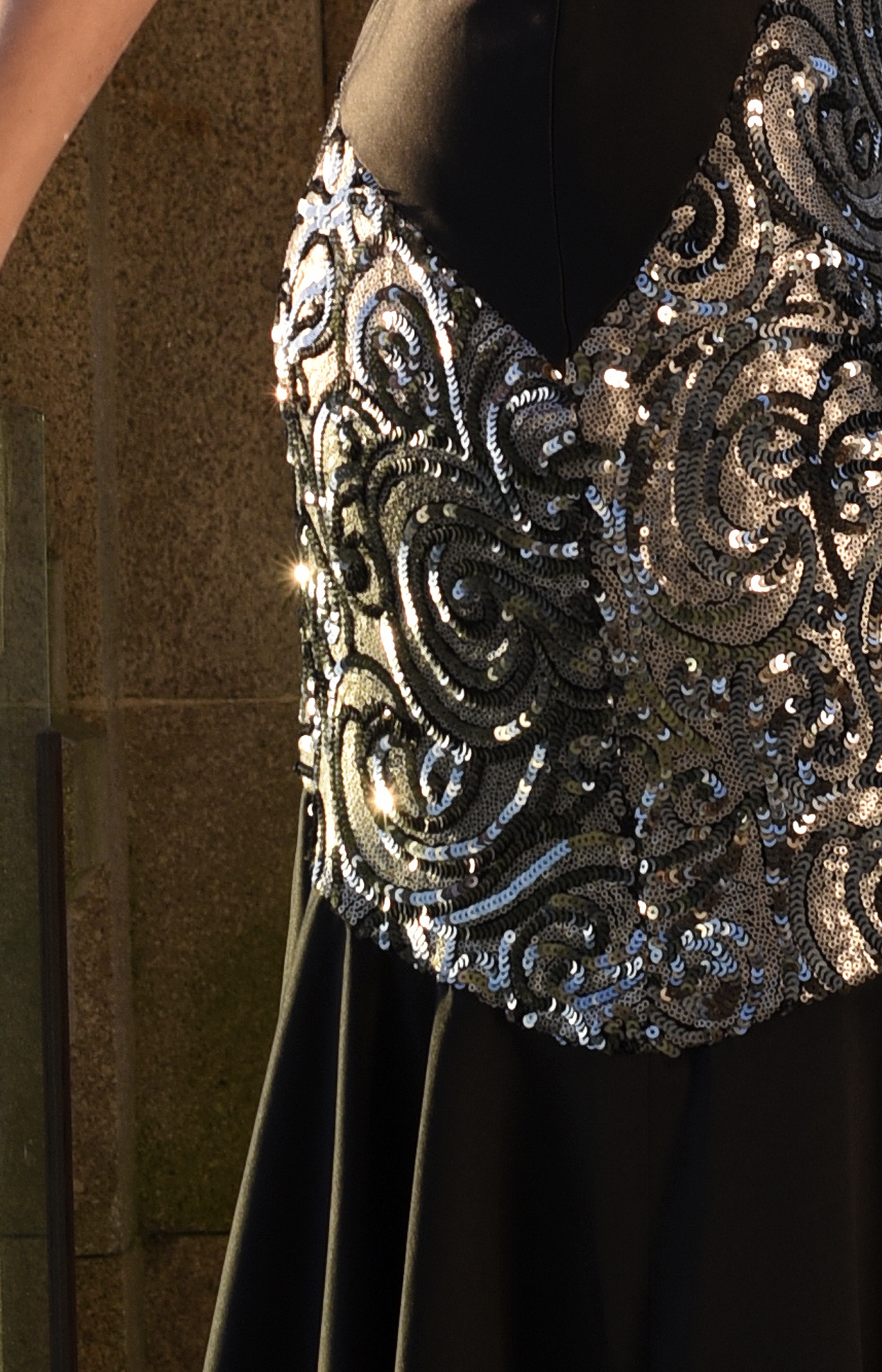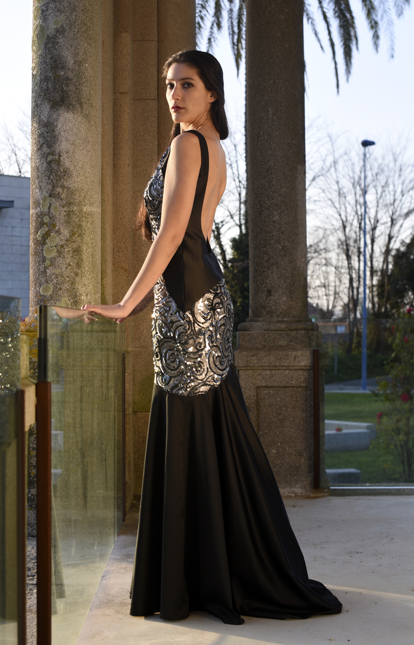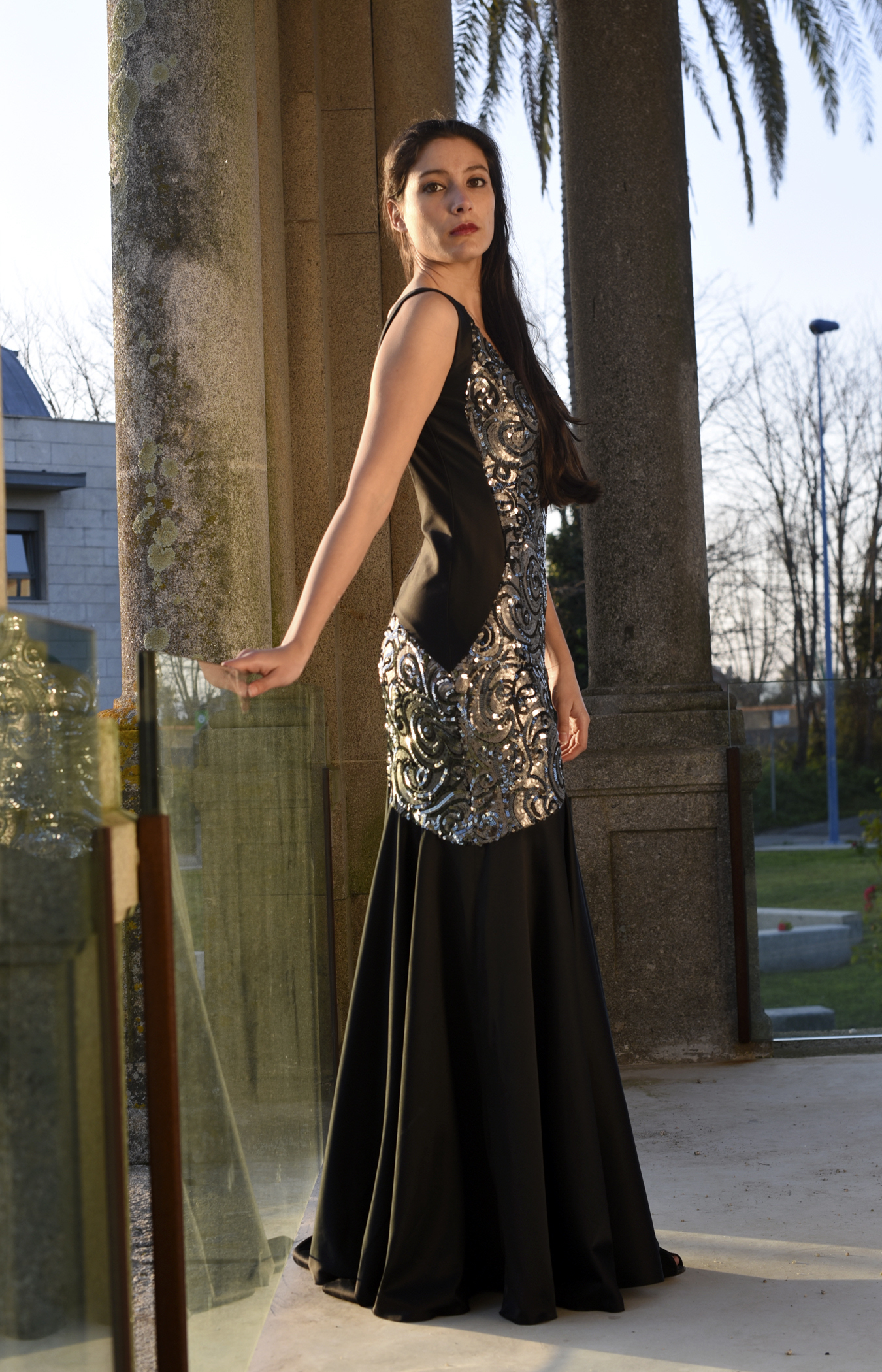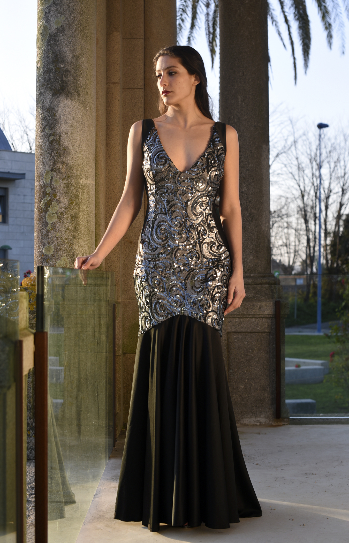 Detalle técnico: La prenda combina magistralmente dos tipos de tejidos de alta calidad: un satén negro liso que se extiende por la falda y los costados, aportando fluidez, peso y elegancia al movimiento, y un cuerpo estructurado en tejido de lentejuela gris oscuro que envuelve el busto y la parte trasera, creando un efecto visual sofisticado, brillante y moderno. La confección artesanal, realizada en España, garantiza acabados perfectos y un ajuste impecable, fiel a la excelencia del sello Javier Barrio