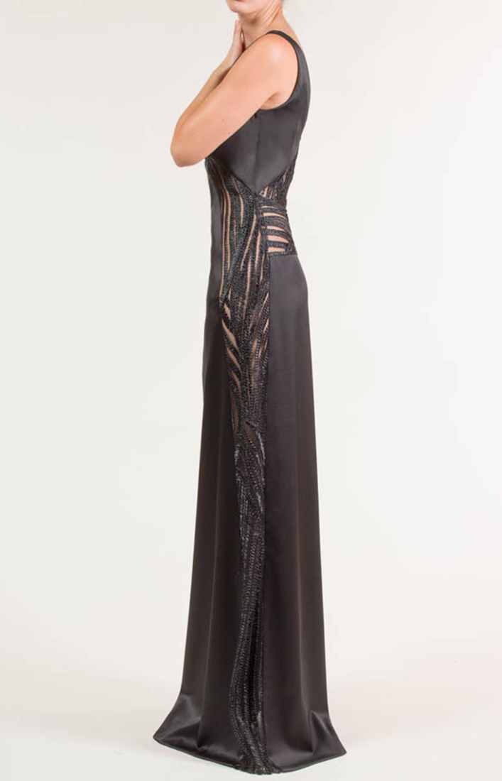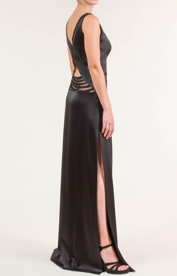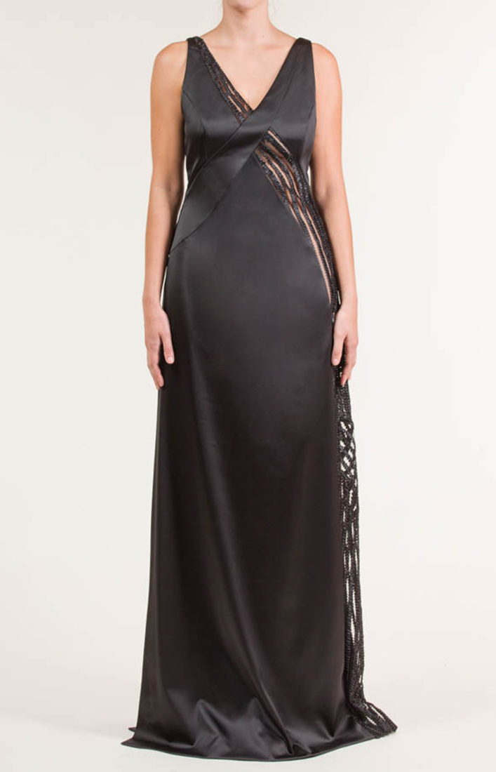 Descripción: El vestido largo Selkis está confeccionado en tejido de satén negro, a juego con tejido bordado con tiras en color negro, sobre una base de tul haciendo transparencias, situado desde el pecho, pasando por cintura, cadera, pierna y también en espalda provocando un cruzado del mismo tejido. Este vestido es de corte recto, escote en pico, espalda con escote ‘cut out’ y abertura en pierna.