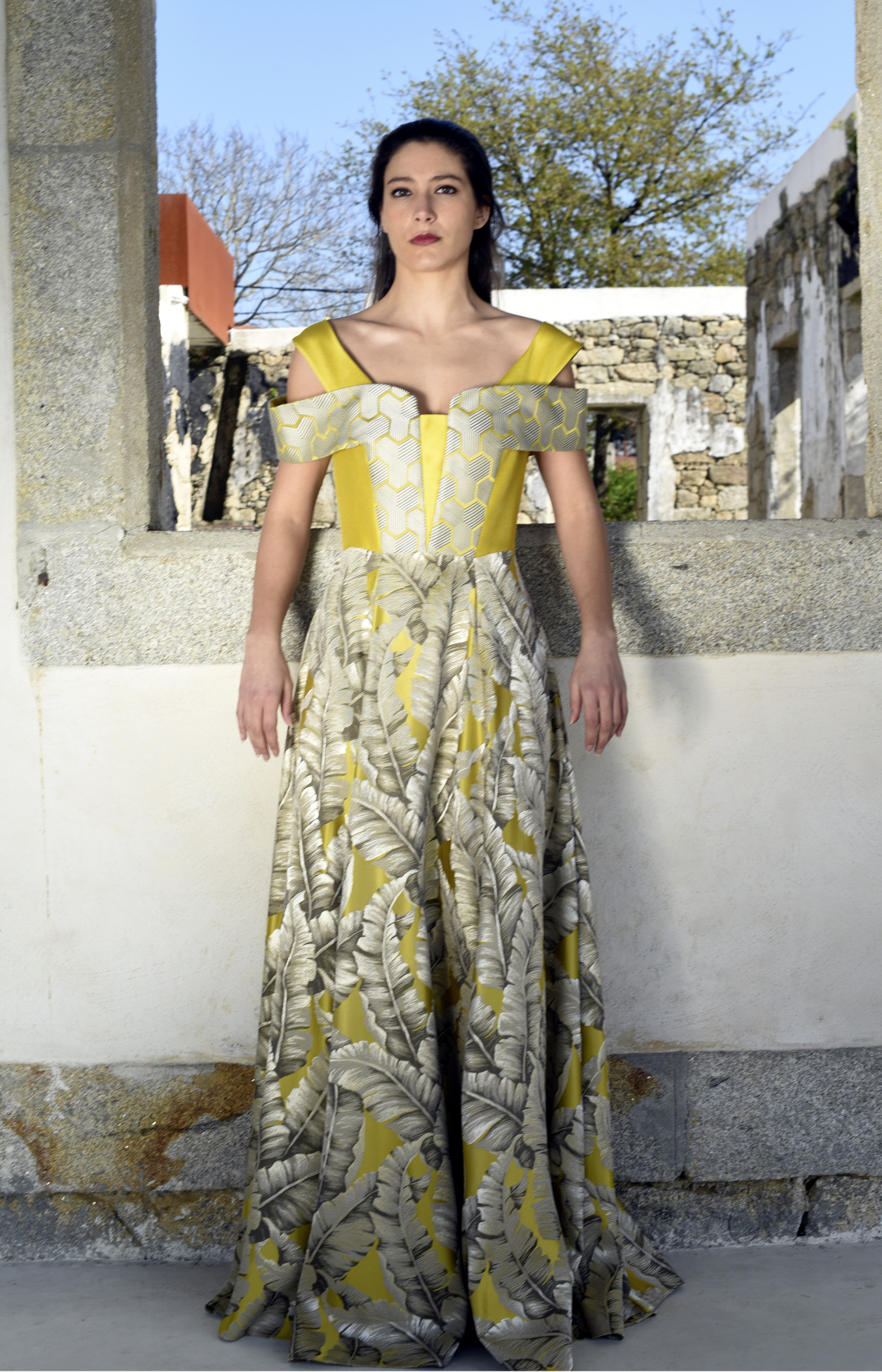El cuerpo del vestido está confeccionado en mikado de seda en tono amarillo, con escote tipo barco caído que combina una pieza superior en jacquard geométrico en tonos beige. La falda amplia está elaborada en jacquard de fondo amarillo con estampado de hojas tropicales en beige y gris, lo que genera un efecto visual natural y elegante. El corte entallado en la cintura equilibra el conjunto, aportando estructura y movimiento.