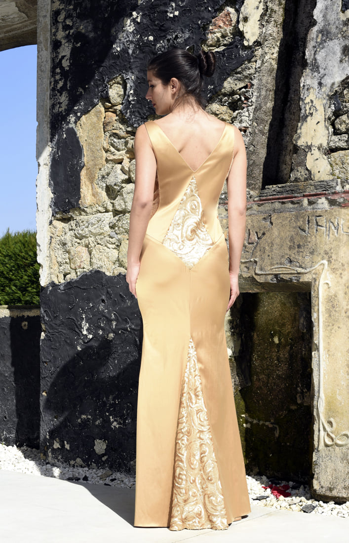 Tejido y colores: Vestido largo en tejido satén en color dorado, a juego con tejido en lentejuela en color dorado, situada en parte central y trasera del vestido y godet inferior trasero.