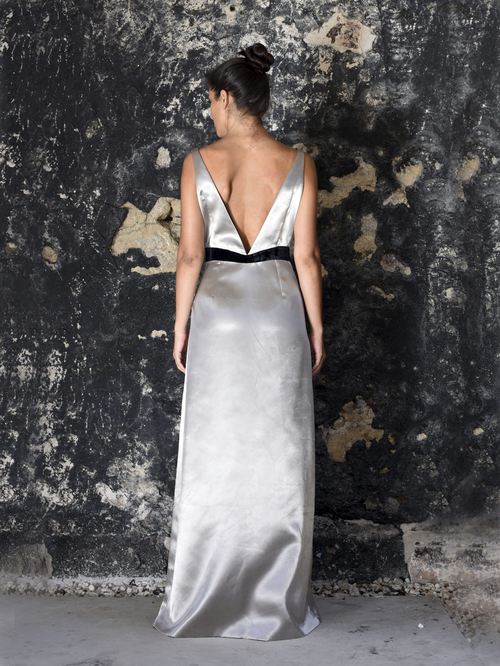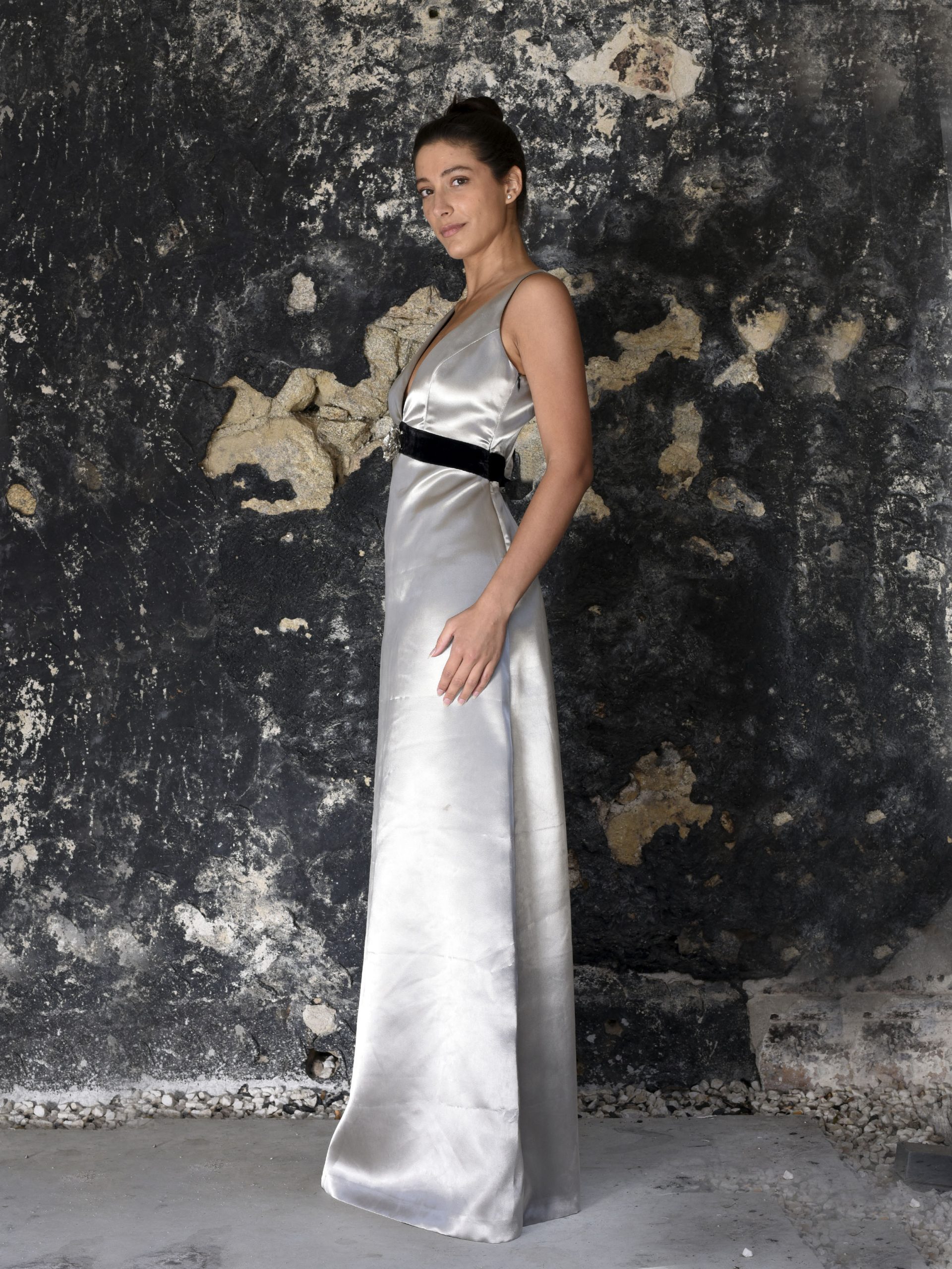 Vestido largo en tejido de raso grueso en color plata, a juego con terciopelo en color negro en cintura, y aplique de flores de metal, con pedrería en color plata vieja en el centro de la cintura.