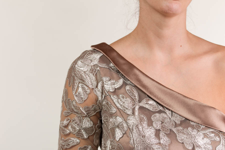 Vestido largo de Alta Costura, corte asimétrico, creado a mano por el diseñador de Haute Couture gallego, Javier Barrio. El vestido es una creación de Alta Costura confeccionado con dos materiales diferentes: Un tejido de tul bordado en tono más claro para contrastar con el satén beige tostado.