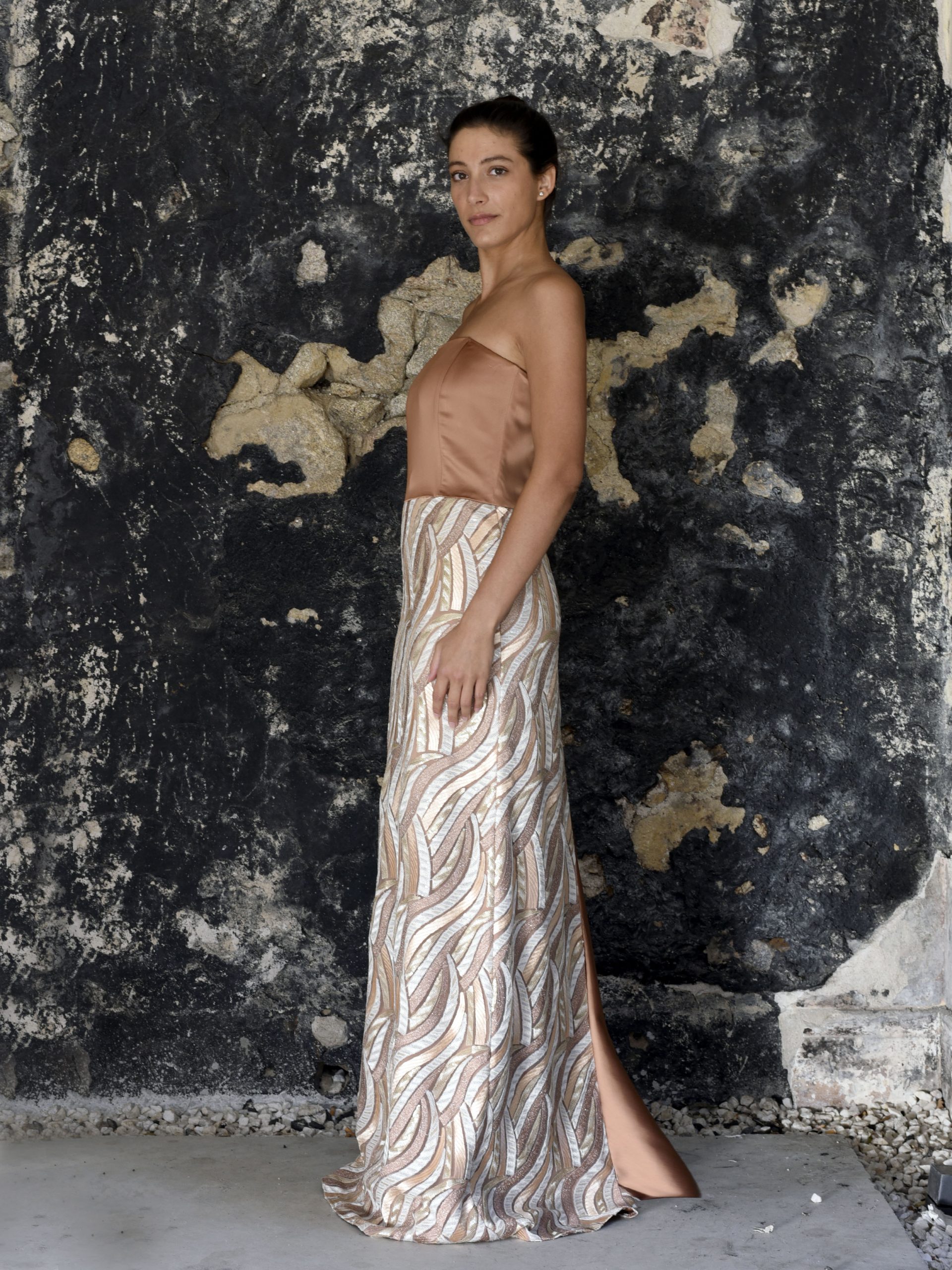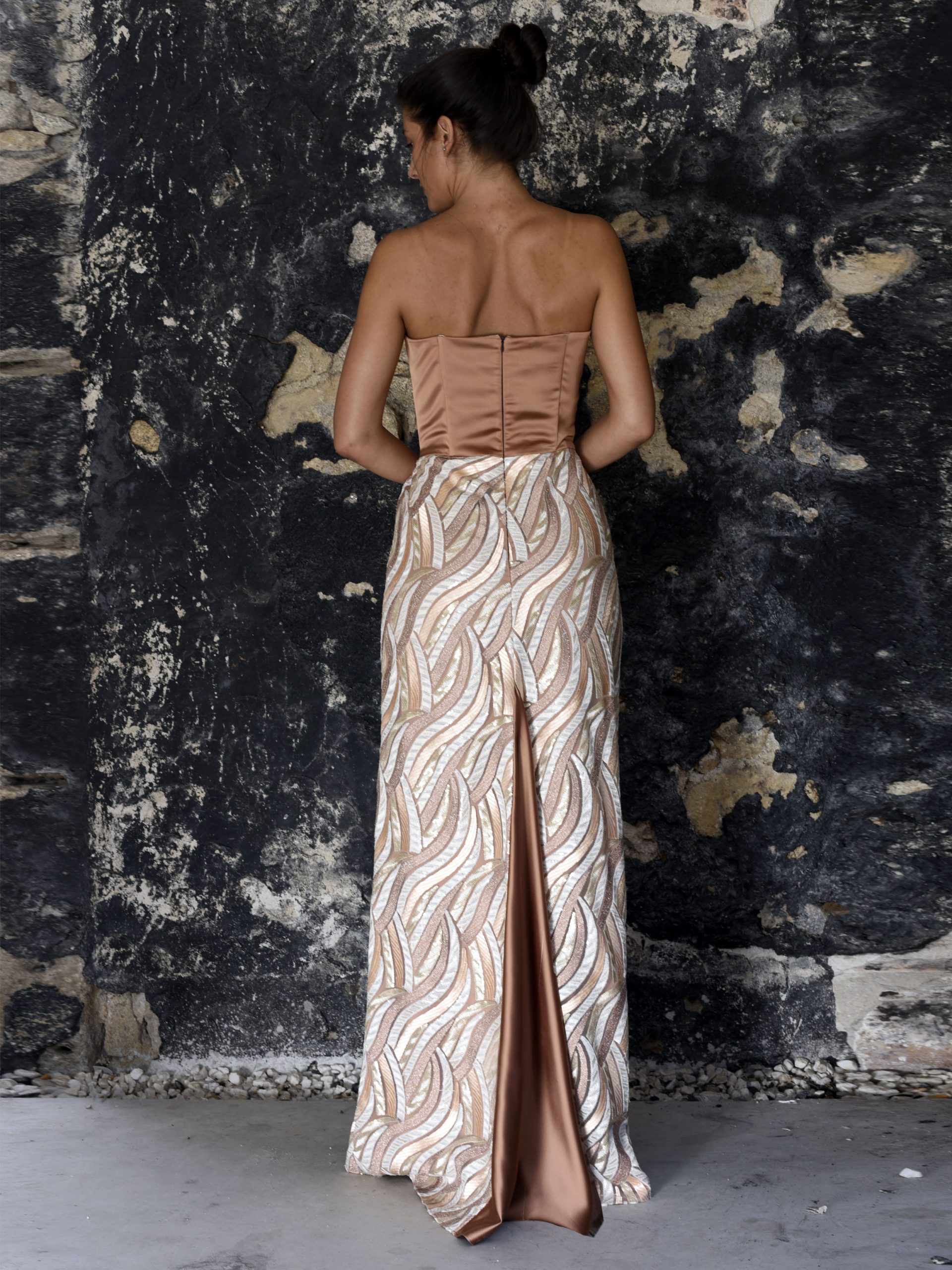 Vestido largo de Alta Costura en colores tierra. El diseño se compone de dos partes bien diferenciadas; la primera es la de arriba, con corte palabra de honor en color liso, tejido satén en color terracota. Y la parte de abajo, una falda compuesta por un tejido bordado con distintos colores de lentejuelas e hilos, todo, en colores tierra: terracota, beige y dorado, de tal forma que el resultado final del vestido recuerda a una pieza de delicada cerámica.