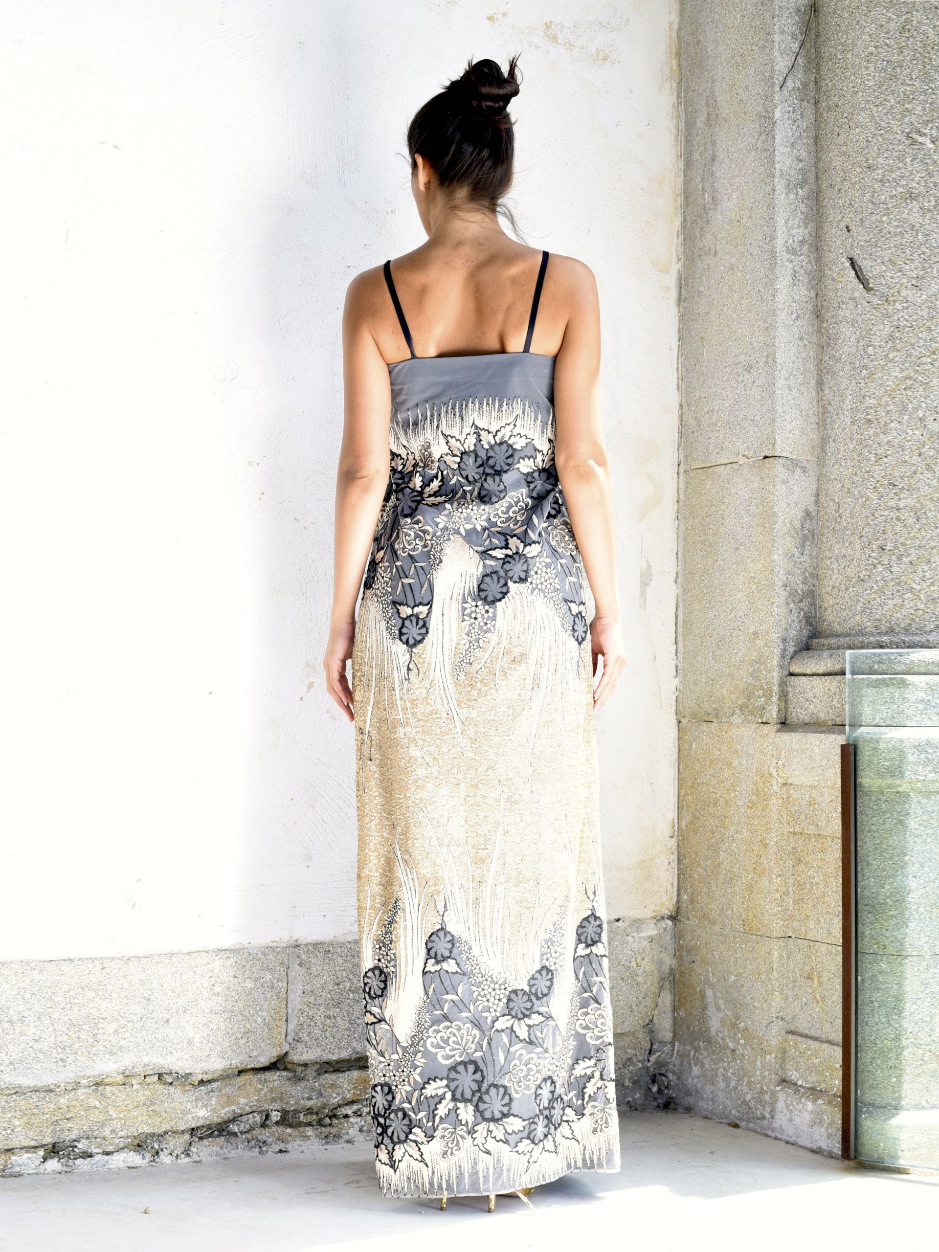 Confeccionado en una base suave y estructurada, el vestido presenta una exquisita capa de lentejuelas bordadas a mano en tonos marfil y gris, formando un delicado motivo floral y vegetal. El trabajo en relieve aporta textura y profundidad al diseño, mientras que los tirantes finos y el escote recto realzan la feminidad con sutileza. El tejido tiene caída natural, lo que aporta movimiento y ligereza al caminar.